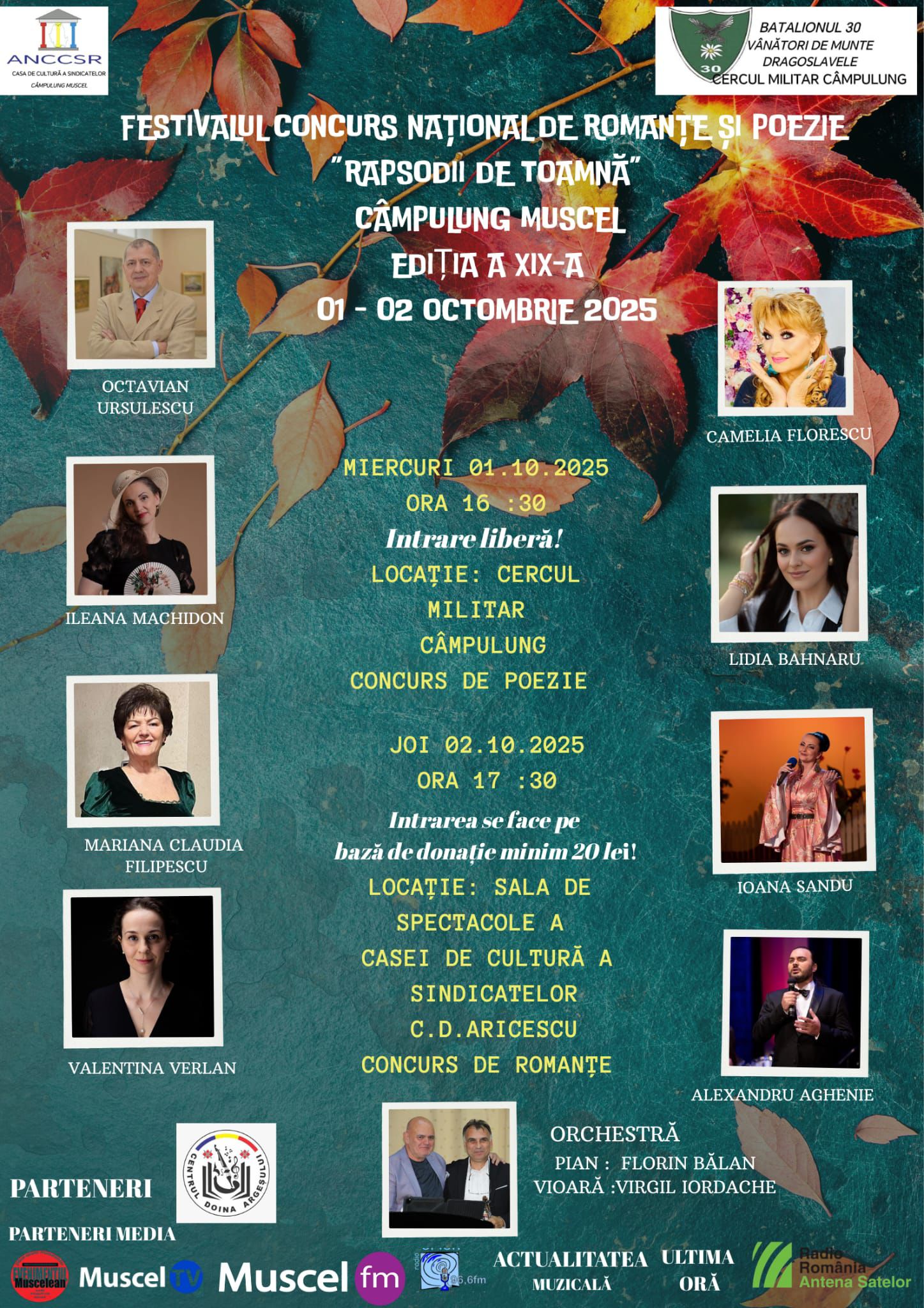 Câmpulung Muscel devine, la început de octombrie, centrul unei manifestări culturale de tradiție. Festivalul Concurs Național de Romanțe și Poezie „Rapsodii de toamnă” va avea loc pe 1 și 2 octombrie, reunind artiști, concurenți și iubitori de cultură într-un cadru elegant, în ton cu renumele boem al orașului și cu spiritul dramaturgului Tudor Mușatescu.
